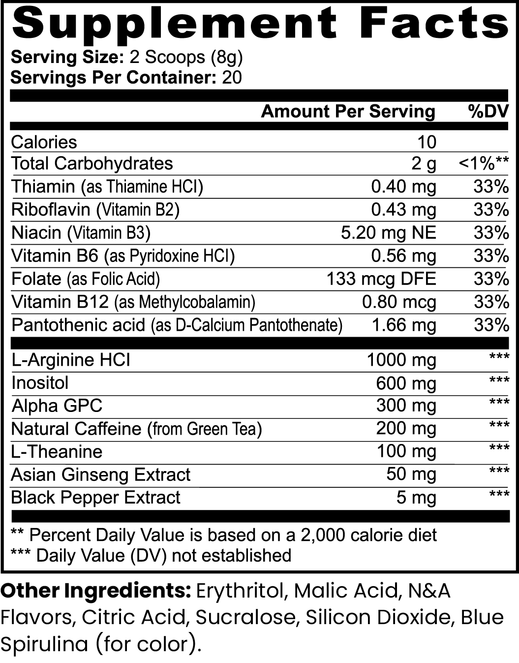 Ingredients: L-Arginine HCl, Inositol, Alpha-GPC, Natural Caffeine (from Green Tea), L-Theanine, Asian Ginseng Extract, Black Pepper Extract, Thiamin (as Thiamine HCl), Riboflavin (Vitamin B2), Niacin (Vitamin B3), Vitamin B6 (as Pyridoxine HCl), Folate (as Folic Acid), Vitamin B12 (as Methylcobalamin), Pantothenic Acid (as D-Calcium Pantothenate), Erythritol, Malic Acid, Natural & Artificial Flavors, Citric Acid, Sucralose, Silicon Dioxide, Blue Spirulina (for color).