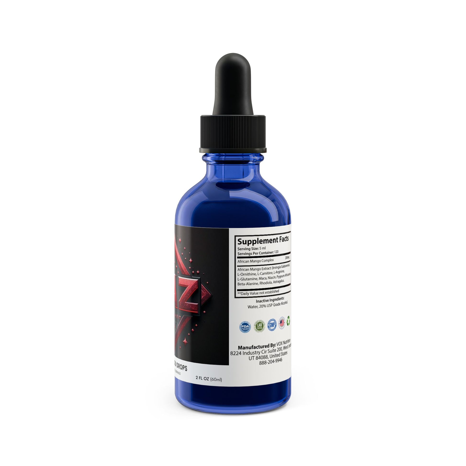 Ingredients: African Mango Complex, African Mango Extract (Irvingia Gabonensis), L-Ornithine, L-Carnitine, L-Arginine, L-Glutamine, Maca, Niacin, Pygeum Africanum, Beta-Alanine, Rhodiola, and Astragalus. Inactive Ingredients: Water, 20% USP Grade Alcohol