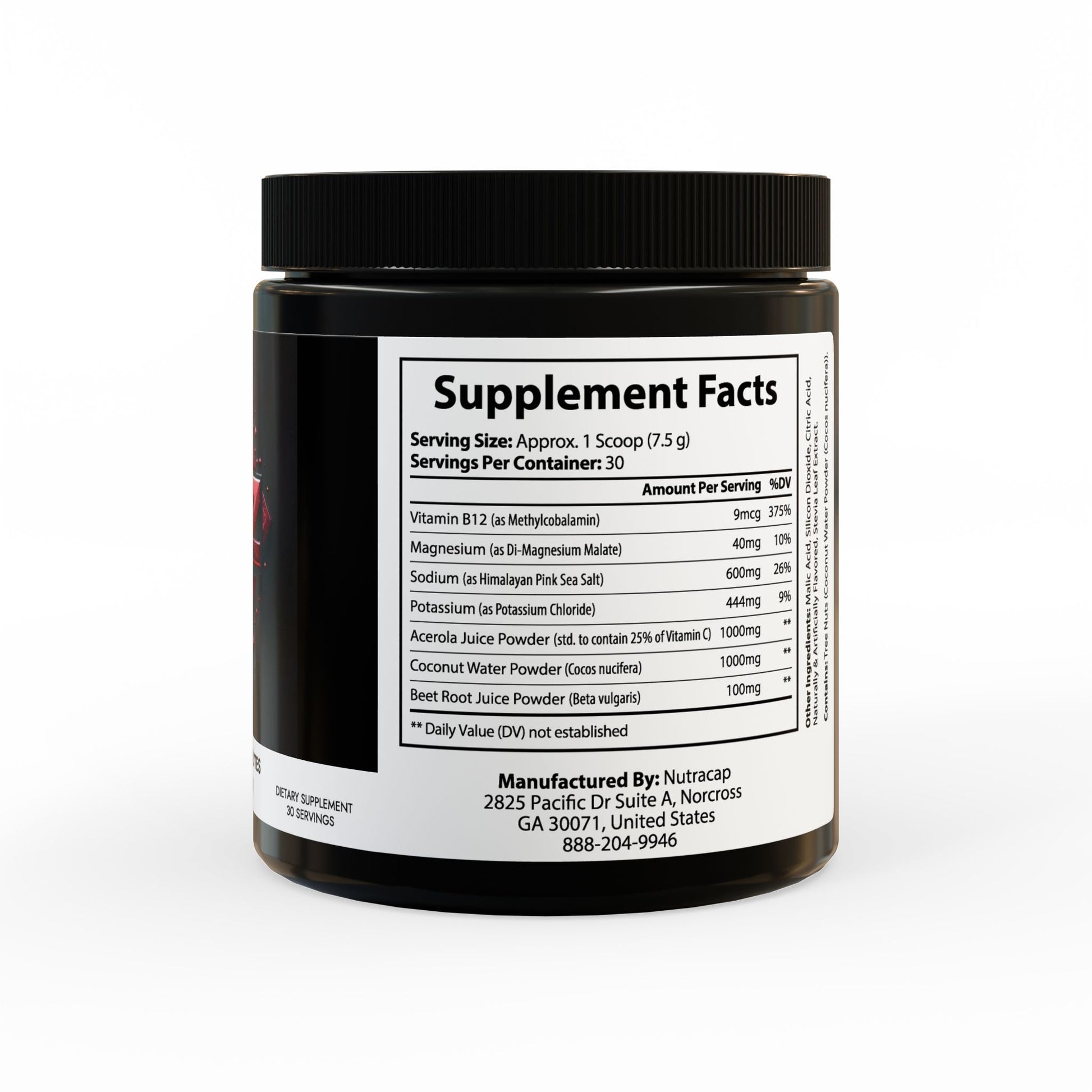 Key ingredients include vitamin B12, magnesium, sodium (as Himalayan pink sea salt), potassium, acerola juice powder (standardized to contain 25% vitamin C), coconut water powder, and beet juice powder.
